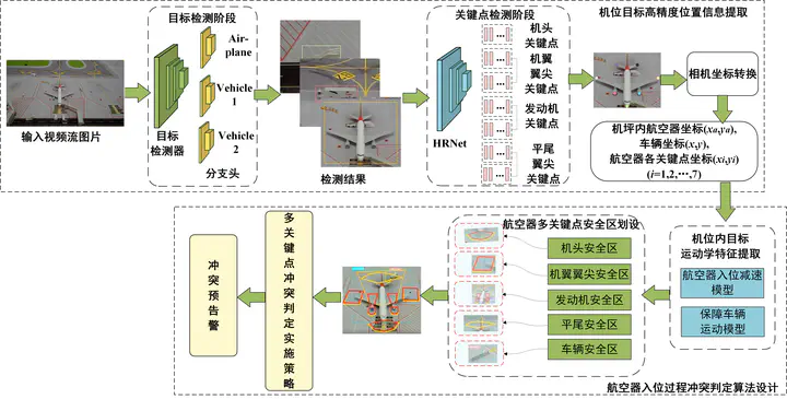 To address the problems of poor level of detail in existing aircraft detection models, limited types of conflict recognition on aprons, and simplified safety zone settings which cannot meet the safety monitoring needs of air traffic controllers, a multi-keypoint detection method for detecting conflicts between aircraft and apron moving vehicles during the aircraft taxi-in process and in the apron parking state is proposed. The proposed method uses a high-resolution keypoint detection network, HRNet, to identify key components such as the nose, engine, and wingtip in a dynamic and refined way. The apron surveillance video is used as the data source, and coordinate conversion algorithm is designed to convert image pixel coordinates to the actual coordinates of the apron surface, improving the accuracy of conflict determination. Kinematic characteristics of aircraft and vehicles in the apron are considered, and an aircraft taxi-in deceleration model and a service vehicle movement model are established. The method includes a safety zone designation approach for aircraft and vehicles in the apron based on apron operation control rules. A multiple conflict detection strategy is designed to address the concurrent occurrence of various conflicts and enable parallel processing of multiple conflicts. A physical sandbox is constructed to compare and analyze the selected aircraft keypoint detection network, and eight typical conflict scenarios are designed to validate the proposed method through simulation experiments. The results show that the keypoint network outperforms the mainstream keypoint detection network in apron operation scenarios. The proposed method achieves real-time aircraft multi-component conflict monitoring, compared with the single-component-based aircraft conflict detection method. The conflict detection method that is designed possesses a high level of accuracy and timeliness, with an Average Precision rate of 96.82 %, an Average Recall rate of 94.87 %, and a calculation delay of 311 ms. The proposed method can provide a reliable means to discriminate and prevent conflicts between aircraft and apron vehicles.